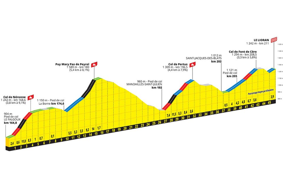 There's 4,350m of climbing, much of it coming towards the end of the stage. After two early climbs, later in the stage there are ascents of the Col de Néronne, Puy Mary Pas de Peyrol, Col de Pertus and Col de Font de Cère.
