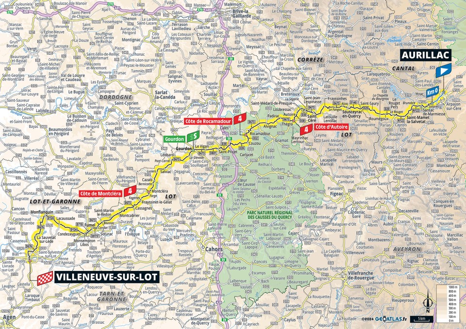 Stage 12 of the Tour de France 2024 is a 203.6km flat stage from Aurillac to Villeneuve-sur-Lot.